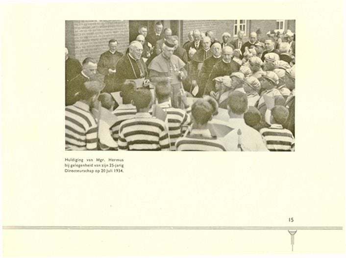 Lezers en Kijkers Bovendien de foto de jongens met de gymanstiektrui met de leiding Br Otgerus ( zie achter stand de broekbretels aandroeg) en andere jongens met de feestelijke muts feliciteren Mgr A Hermus van de 25 jarige ditecteurschap daarvoor heeft een goede naar de zin om het feest op het instituut mochten vierden. De aanwezig de naast van Mgr A Hermus links stond de bisschop van Den Bosch Mgr Diepen en achter iets helft hoofd Mgr J v Overbeek. Rechts vooraan Br Jeroen de achter Br Cesarius en geheel rechts Br Corsinus - Mhr Bartels priesterleraar en Br Radelphus. Nog altijd wie de koperen, zilveren, 40 jarige - gouden - diamanten jubileum wordt de invoering toneelstuk gehouden door de organistatie van Br Arnoldus en Br Richardo. Invoering van gymanstiek door Br Otgerus. Zo gevierde feest op het instituut op 1889 12,5 jaar priester - 1912 25 jaar priester - 1927 40 jaar priester en 1937 50 jaar priester.
