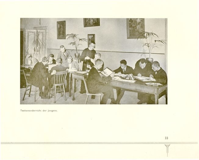 Foto 32 en 33 allebeiden de toekenonderzicht in de school en zaal. Bij de jongens in de zaal hebben opgeleid door links Br Richardo en rechts Br Alanus in 1934.