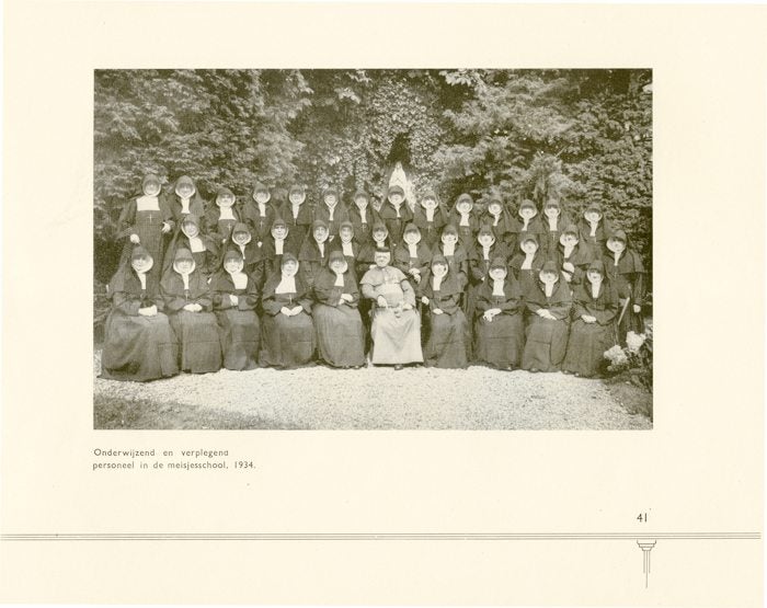 Foto 34 Talrijke totaal Zusters zijn ongeveer 40 Zusters die op ivd zijn werkzaam. Ik ken de namen van de Zusters helemaal niet dat haar het gezichten niet zo duidelijk zichtbaar met ingeloten van de ronde kappen. Bij de meisjesafdeling toebehoorden nog meer Zusters en Personelen (oud-leerlingen) waar ze de werkzaam waren op de keuken, wasserij, atelier van de handwerk, hostiebakkerij, voorschool, klassen en nog meer. In lange jaren was het begonnen in 1840 tot met 1987 dus 147 jaar en nog enige zusters verbleef tot in 1990. En de Broeders vanaf in 1845 (de overgenomen van 6 Broeders der Xaverianen van Brugge) tot in 1987 dus 142 jaar.