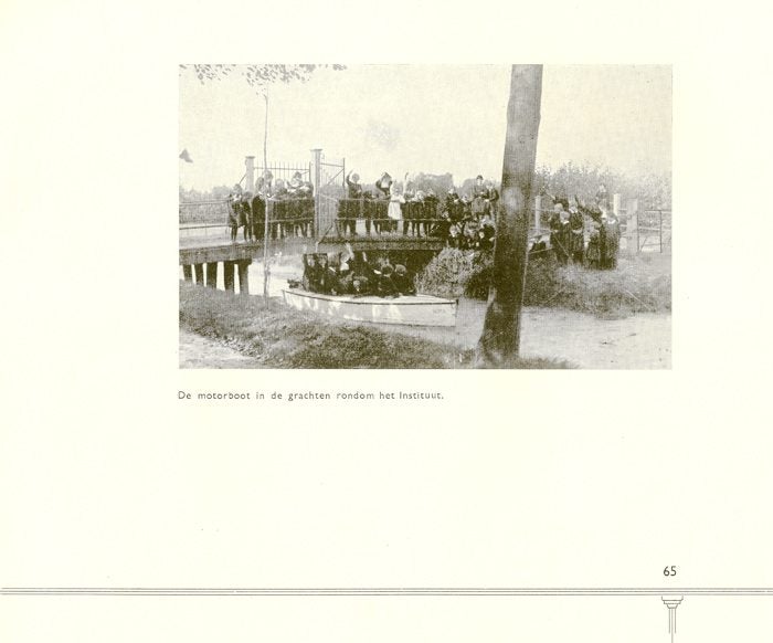 Lezers en Kijkers Foto 65 Moterboot in de gracht bij de Meisjesafdeling die varen de meijes in de gracht niet rondom van het instituut dus maar de helft links van de vierkante gracht. Mijn leeftijd in 12 jaren op het instituut heb de moterboot nooit gezien en gevaren. naar de Meisjesafdeling voor de Jongens en Broeders worden niet toegestaan en moest altijd de tostemming aan de Zusters vragen. En ook de grens van de jongensafdeling en mesjesafdeling de gracht met flinke prikkeldraad wordt geplaatst door het klachten van de Zusters dat de enkele jongens zijn overgeschreden naar de meisjesafdeling in de tuin en ook in de gracht hebben gezwommen.