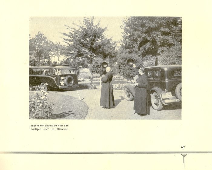 Foto 69 de bedevaart der jongens per bus naar de heilige Eik te Orischot die het gelegenheid van het jubileum van de directeurschap Mgr A. Hermus in 1935.