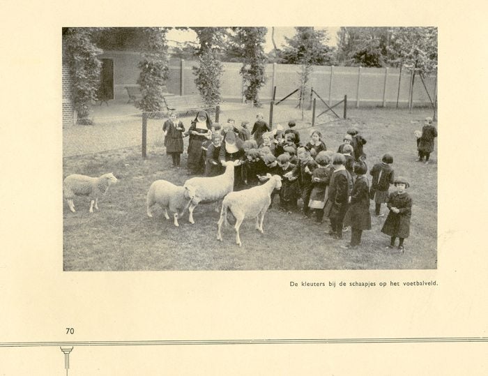 Foto 67 het voetbalveld van de jongens dat daar hebben 3 velden van de groep 1 - 2 - 3 en ook een speetuin met wip, draaimolen en schommels. Vroeger het eerste voetballen van de jongens waren 2 Broeders Theobertus en Corsinus in 1934. De voetballers droegen geen voetbaltrui en broek en dan maar gewoon ging voetballen met het kleding en opgerolde zwarte kousen tot onder van knie. Vroeger alle jongens moesten zeer gepaste kleding dragen en behalve ontbloot van het hoofd en handen.