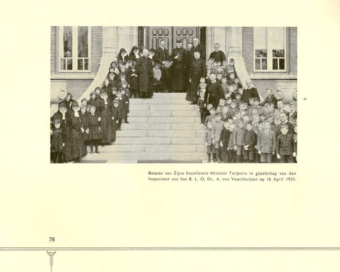 Lezers en kijkers. Foto 77 zo wederom op 3 juni 2012 het gelegenheid de zilveren priesterjubileum van Mgr A. Hermus kreeg het bezoek van de leden het Nederlandse Episcopaat en stond de dove jongentje een kleine toespraak met briefje voor het verwelkomst op het Instituut. Alle jongens droegen de Zondagspak en vierde als de Zondag. Zo zeer brave dove jongens met goede zoete van de Broeders dat gaven ze niemand de straf in hoek. S middags de maaltijd kregen ze een sniaasappel dat iedereen waren heel blij voor een oranje kleurige fruit. Zo het gewoonelojk het hoge bezoek op het instituut vierden de jongens en meisjes als de zondag met zondagspak. Geen school geen ambacht maar wel 2 keer onder de H. Mis en s middags lof. Zie foto 78 zo precies hetzelfde de hoge bezoek op het instituut worden de kleine jongens en meisjes met Broeders en Zusters opgeroepen voor een mooie kiekje de boven trap van het hoofdgebouw instituut. Ik was toevallig op de voorschool.