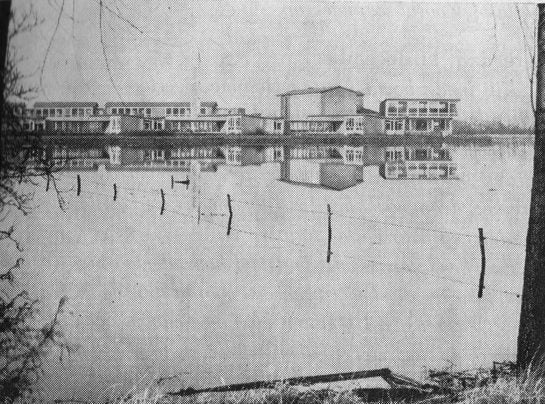 Wateroverlast achter IvD bij meisjesschool, dankzij langdurige regenval... Foto gemaakt in november 1966