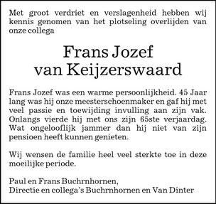 Hij was licht slechthorende. Ruim 45 jaar heeft hij als meesterschoenmaker gewerkt. Helaas mocht hij niet van zijn pensioen kunnen genieten.